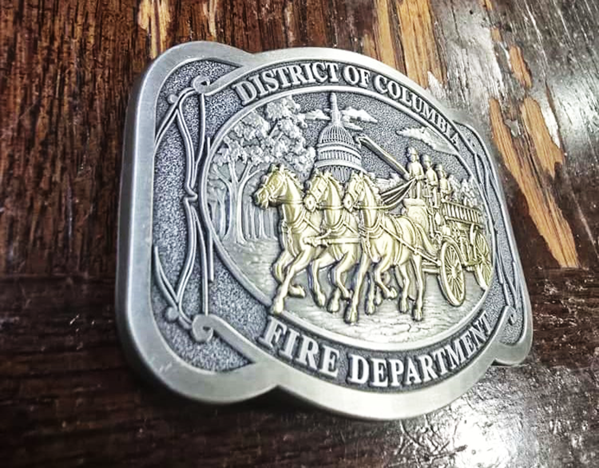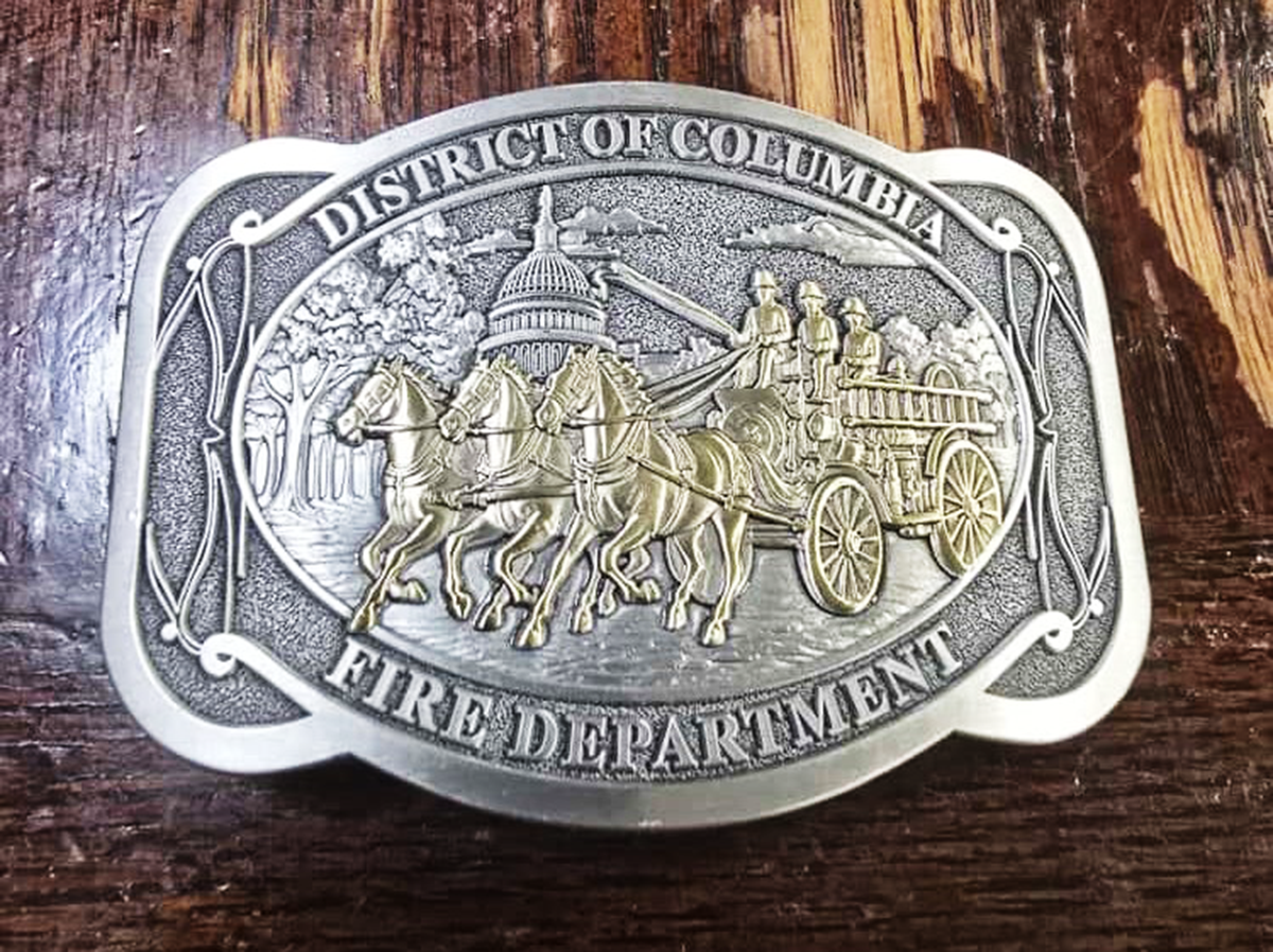 Honor the rich history of the District of Columbia Fire Department with this exceptional belt buckle featuring a detailed bronze relief of a horse-drawn apparatus. This premium buckle showcases three firefighters aboard their historic apparatus with the iconic U.S. Capitol building in the background, all set against a beautifully textured silver finish.